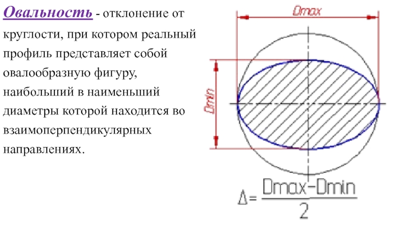 Слайд 13Овальность - отклонение от круглости, при котором реальный профиль представляет собой
