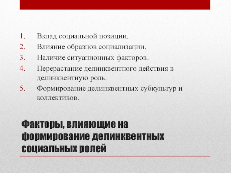 Факторы, влияющие на формирование делинквентных социальных ролейВклад социальной позиции. Влияние образцов социализации. Наличие ситуационных факторов. Перерастание делинквентного