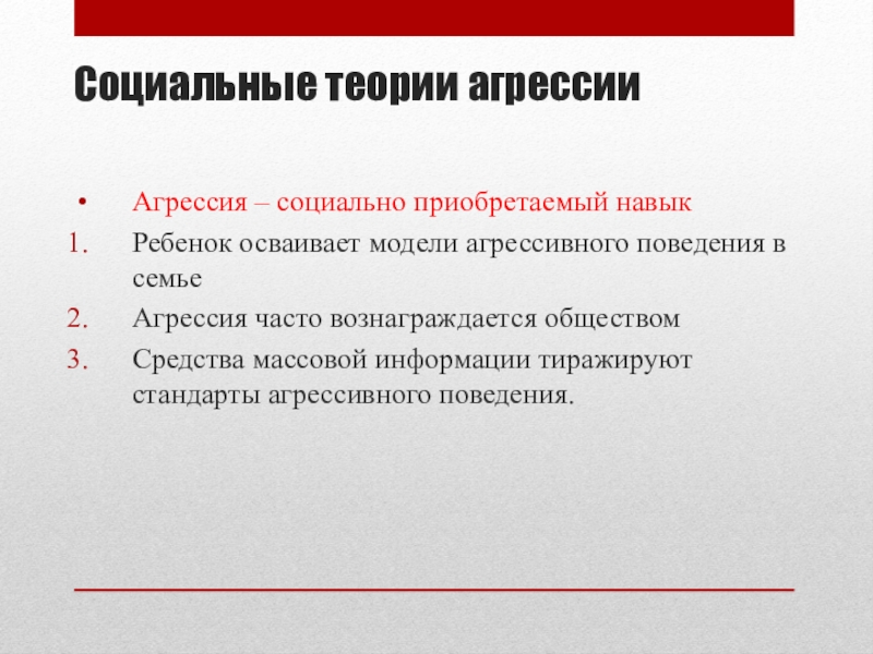 Социальные теории агрессии  Агрессия – социально приобретаемый навыкРебенок осваивает модели агрессивного поведения в семьеАгрессия часто вознаграждается