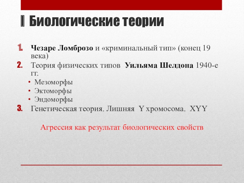 I Биологические теории  Чезаре Ломброзо и «криминальный тип» (конец 19 века)Теория физических типов Уильяма Шелдона 1940-е