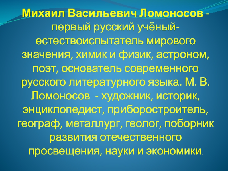 Михаил Васильевич Ломоносов - первый русский учёный-естествоиспытатель мирового значения, химик и физик, астроном, поэт, основатель современного русского литературного языка. М. В.  Ломоносов  - художник, историк, энциклопедист, приборостроитель, географ, металлург, геолог, поборник развития