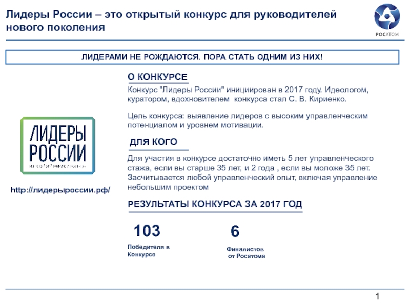 стал С. В. Кириенко.Цель конкурса: выявление лидеров с высоким управленческим потенциалом и уровнем мотивации.
