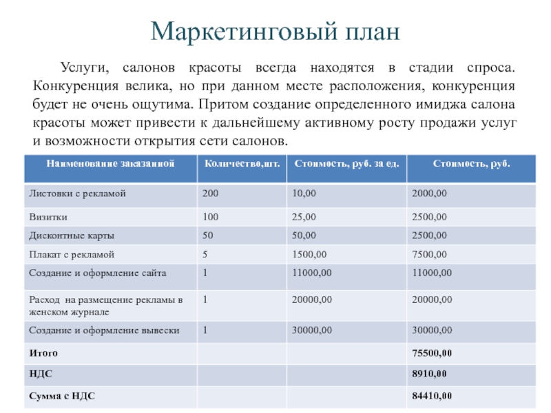 расположения, конкуренция будет не очень ощутима. Притом создание определенного имиджа салона красоты может привести к дальнейшему активному росту продажи услуг и возможности открытия сети салонов.