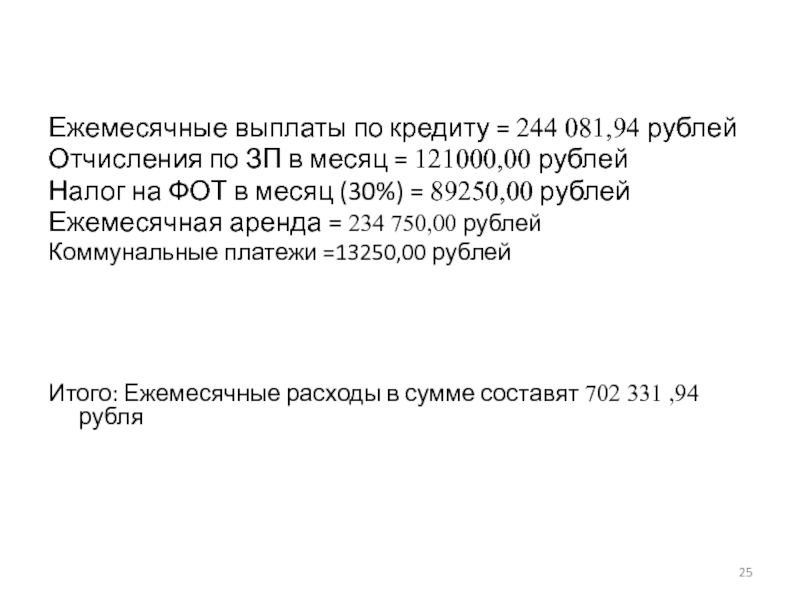Итого: Ежемесячные расходы в сумме составят 702 331 ,94 рубля
