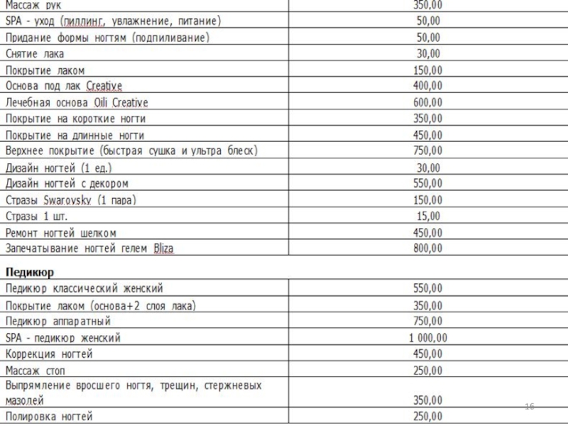 Слайд 14Прейскурант цен на услуги в салоне красоты.