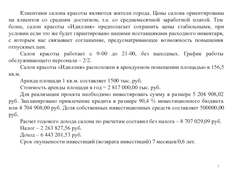 Расчет годового дохода салона по расчетам составил без налога – 8 707 029,09 руб.
