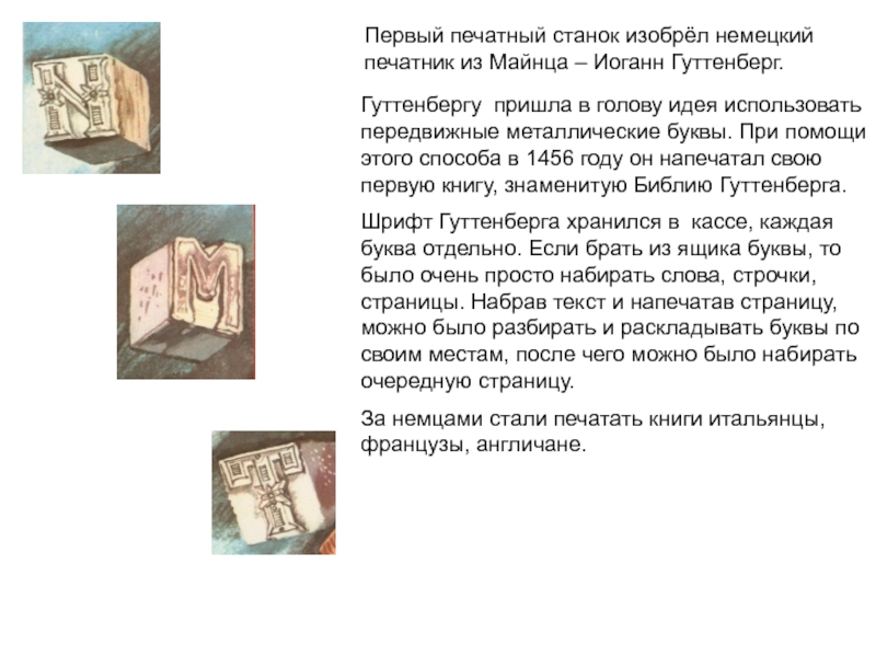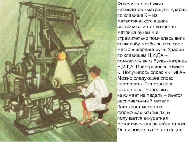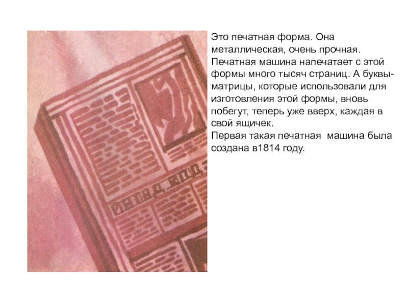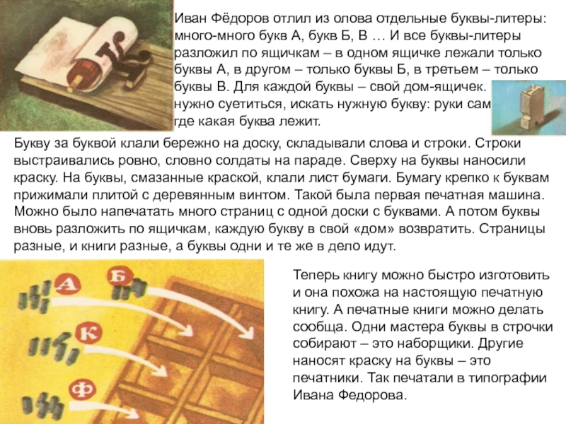 много веков после этого книги были такой редкостью, а умеющих читать, а также тех, кто мог позволить себе иметь книги, было так немного, что в книгопечатании не было необходимости.Первые книгопечатники в качестве клише использовали деревянные доски. На их поверхности вырезали рисунки. Затем эти формы намазывали краской и с них изображение переносилось на бумагу при помощи неуклюжих прессов того времени. Потом картинки стали сопровождаться словами, но их тоже надо было вырезать на дереве.