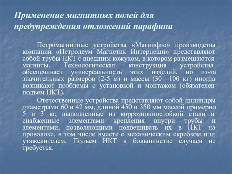 внешним кожухом, в котором размещаются магниты. Технологическая конструкция устройства обеспечивает универсальность этих изделий, но из-за значительных размеров (2-5 м) и массы (30—100 кг) иногда возникают проблемы с установкой и монтажом (обязателен подъем НКТ).