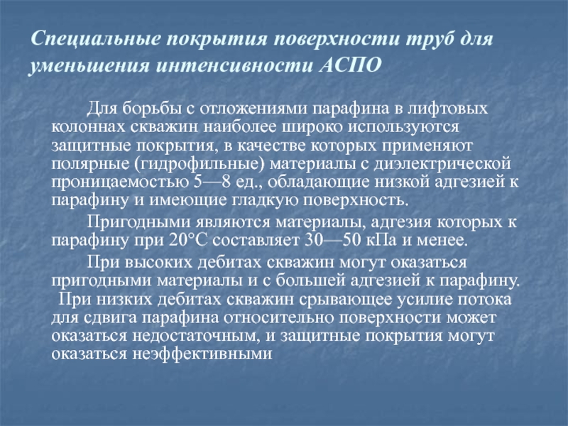 Слайд 22Специальные покрытия поверхности труб для уменьшения интенсивности АСПО