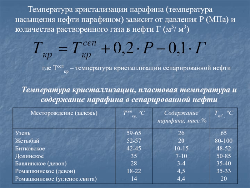 Температура кристаллизации, пластовая температура и содержание парафина в сепарированной нефти