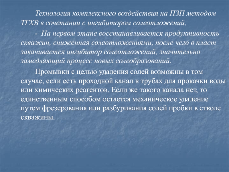 солеотложениями, после чего в пласт закачивается ингибитор солеотложений, значительно замедляющий процесс новых солеобразований.