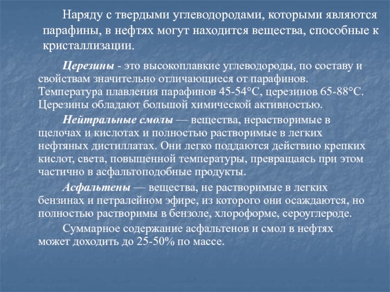 Слайд 14 Наряду с твердыми углеводородами, которыми являются парафины, в нефтях могут