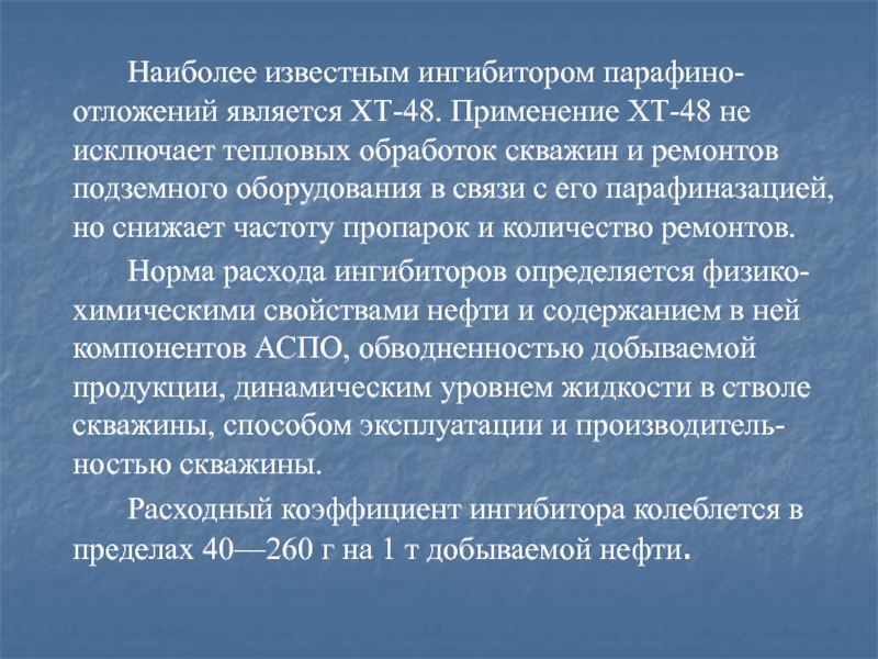 Слайд 21 Наиболее известным ингибитором парафино-отложений является ХТ-48. Применение ХТ-48 не исключает