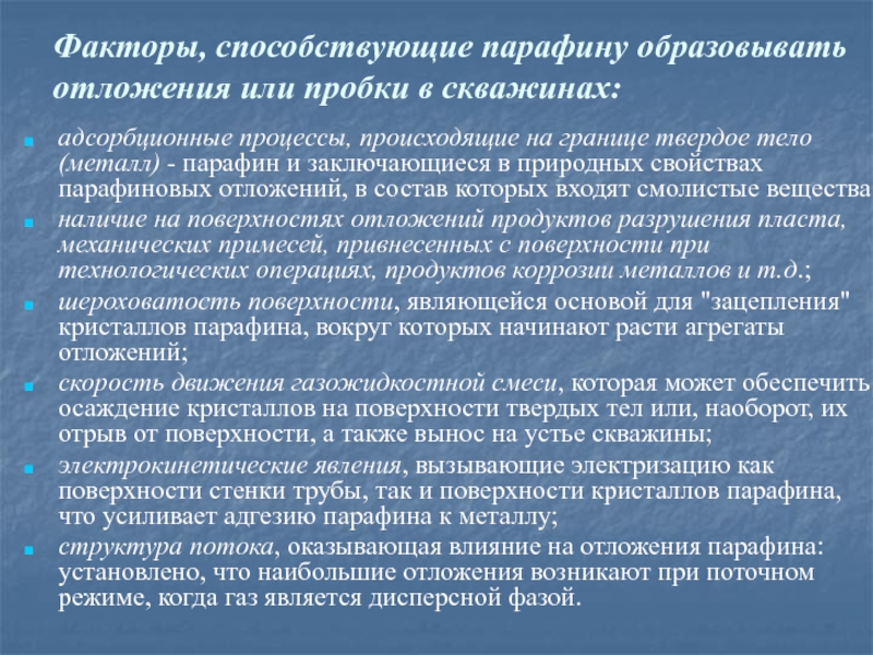 Слайд 11Факторы, способствующие парафину образовывать отложения или пробки в скважинах: