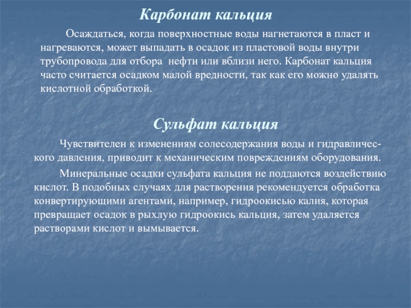 для отбора нефти или вблизи него. Карбонат кальция часто считается осадком малой вредности, так как его можно удалять кислотной обработкой.