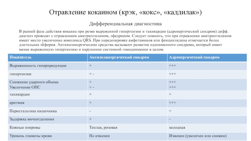 проводят с отравлением амитриптилином, эфедроном. Следует помнить, что при отравлении амитриптилином имеет место увеличение комплекса QRS. При передозировке амфетаминов или фенциклидина отмечается более длительная эйфория. Антихолинергические средства вызывают развитие одноименного синдрома, который имеет менее выраженную гипертензию и нарушения системной гемодинамики в целом.