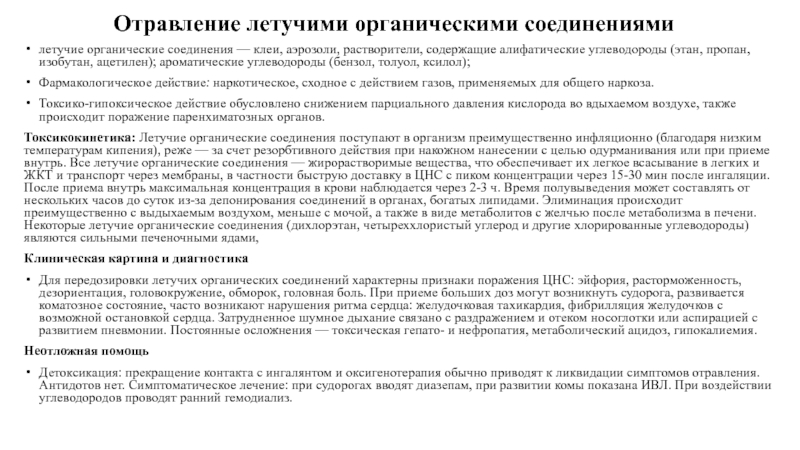 Токсикокинетика: Летучие органические соединения поступают в организм преимущественно инфляционно (благодаря низким температурам кипения), реже — за счет резорбтивного действия при накожном нанесении с целью одурманивания или при приеме внутрь. Все летучие органические соединения — жирорастворимые вещества, что обеспечивает их легкое всасывание в легких и ЖКТ и транспорт через мембраны, в частности быструю доставку в ЦНС с пиком концентрации через 15-30 мин после ингаляции. После приема внутрь максимальная концентрация в крови наблюдается через 2-3 ч. Время полувыведения может составлять от нескольких часов до суток из-за депонирования соединений в органах, богатых липидами. Элиминация происходит преимущественно с выдыхаемым воздухом, меньше с мочой, а также в виде метаболитов с желчью после метаболизма в печени. Некоторые летучие органические соединения (дихлорэтан, четыреххлористый углерод и другие хлорированные углеводороды) являются сильными печеночными ядами,