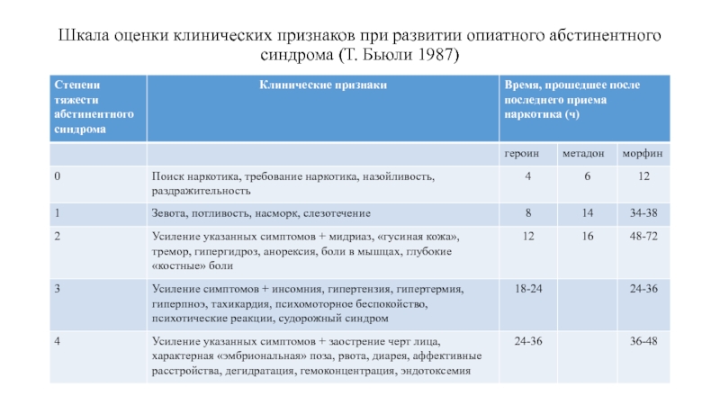 Слайд 5Шкала оценки клинических признаков при развитии опиатного абстинентного синдрома (Т.