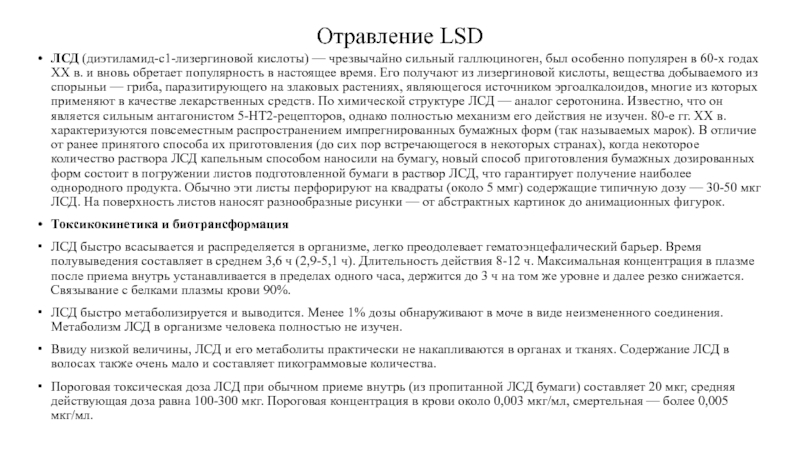 настоящее время. Его получают из лизергиновой кислоты, вещества добываемого из спорыньи — гриба, паразитирующего на злаковых растениях, являющегося источником эргоалкалоидов, многие из которых применяют в качестве лекарственных средств. По химической структуре ЛСД — аналог серотонина. Известно, что он является сильным антагонистом 5-НТ2-рецепторов, однако полностью механизм его действия не изучен. 80-е гг. XX в. характеризуются повсеместным распространением импрегнированных бумажных форм (так называемых марок). В отличие от ранее принятого способа их приготовления (до сих пор встречающегося в некоторых странах), когда некоторое количество раствора ЛСД капельным способом наносили на бумагу, новый способ приготовления бумажных дозированных форм состоит в погружении листов подготовленной бумаги в раствор ЛСД, что гарантирует получение наиболее однородного продукта. Обычно эти листы перфорируют на квадраты (около 5 ммг) содержащие типичную дозу — 30-50 мкг ЛСД. На поверхность листов наносят разнообразные рисунки — от абстрактных картинок до анимационных фигурок.