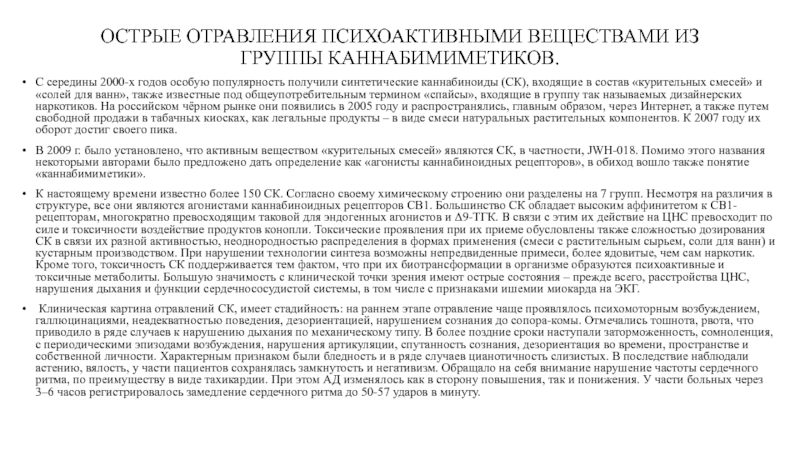Слайд 14ОСТРЫЕ ОТРАВЛЕНИЯ ПСИХОАКТИВНЫМИ ВЕЩЕСТВАМИ ИЗ ГРУППЫ КАННАБИМИМЕТИКОВ.