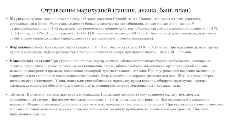 растения, спрессованная в блоки. Марихуана содержит большое количество каннабиоидов, однако только один - дельта-9-тетрагидроканнабинол (ТГК) оказывает первичное психотропное действие. Обычная сигарета с марихуаной содержит 1 - 3 % ТГК (иногда до 15%). Гашиш содержит 3 - 6% ТГК, гашишное масло - до 50 % ТГК. Токсичность дозозависимая, отмечается значительная индивидуальная вариабельность (в зависимости от степени привыкания).