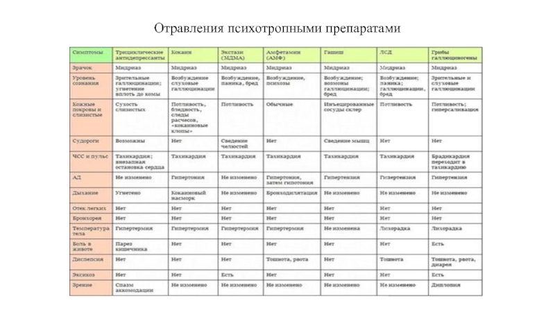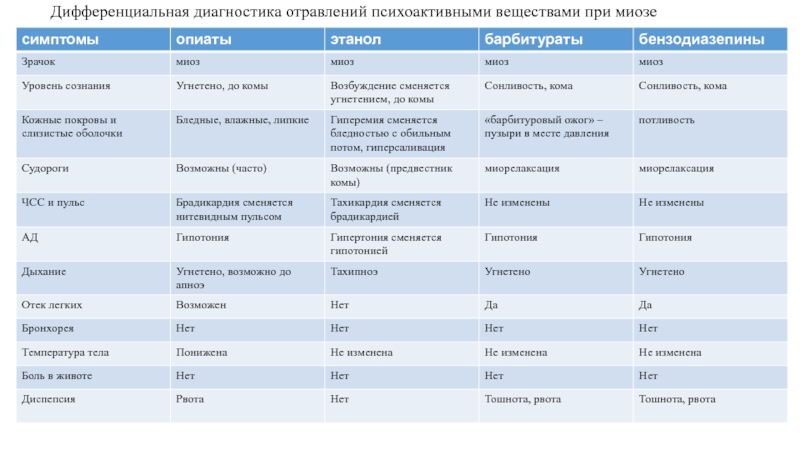 Слайд 4Дифференциальная диагностика отравлений психоактивными веществами при миозе