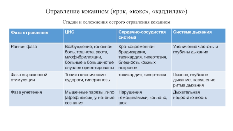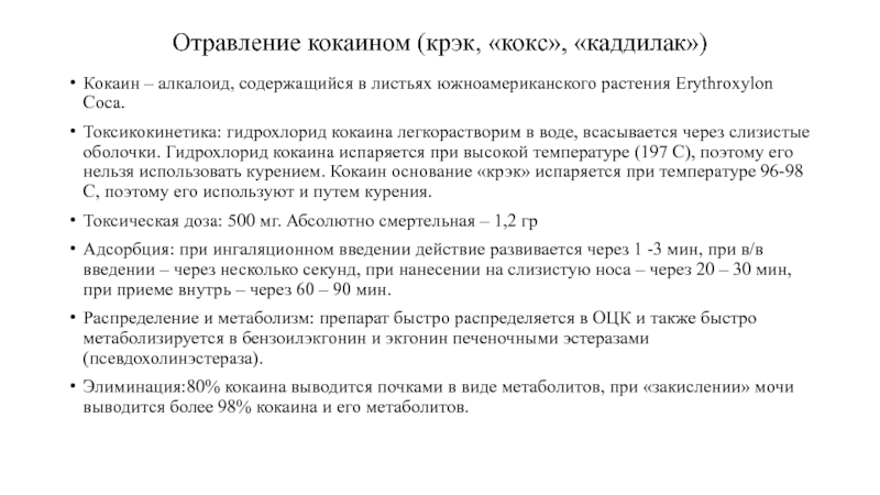 Слайд 8Отравление кокаином (крэк, «кокс», «каддилак»)