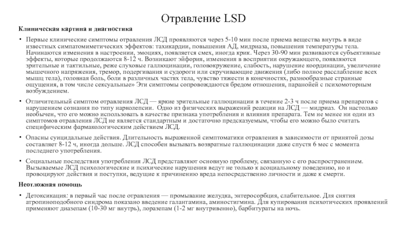 Отличительный симптом отравления ЛСД — яркие зрительные галлюцинации в течение 2-3 ч после приема препаратов с нарушением сознания по типу нарколепсии. Одно из физических выражений реакции на ЛСД — мидриаз. Он настолько необычен, что его можно использовать в качестве признака употребления и влияния препарата. Тем не менее ни один из симптомов отравления ЛСД не является стандартным и достаточно предсказуемым, чтобы его можно было считать специфическим фармакологическим действием ЛСД.