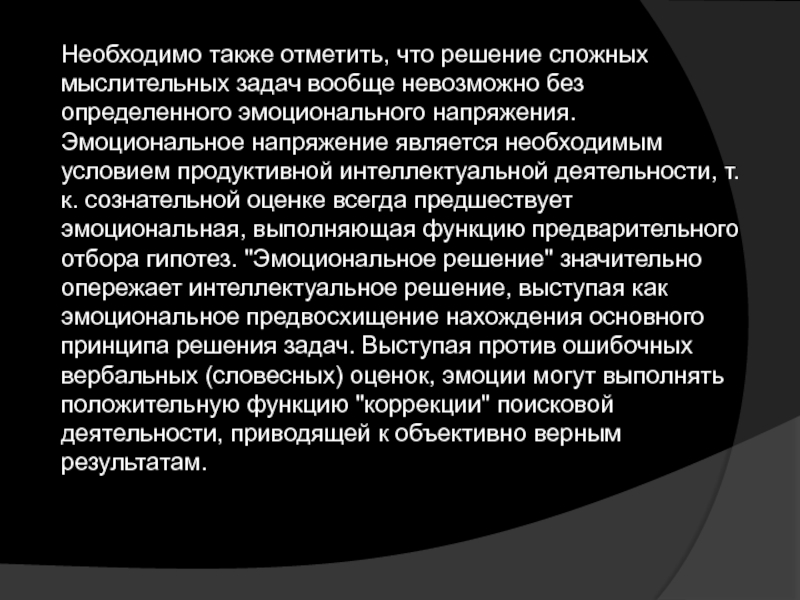 интеллектуальной деятельности, т.к. сознательной оценке всегда предшествует эмоциональная, выполняющая функцию предварительного отбора гипотез. "Эмоциональное решение" значительно опережает интеллектуальное решение, выступая как эмоциональное предвосхищение нахождения основного принципа решения задач. Выступая против ошибочных вербальных (словесных) оценок, эмоции могут выполнять положительную функцию "коррекции" поисковой деятельности, приводящей к объективно верным результатам.