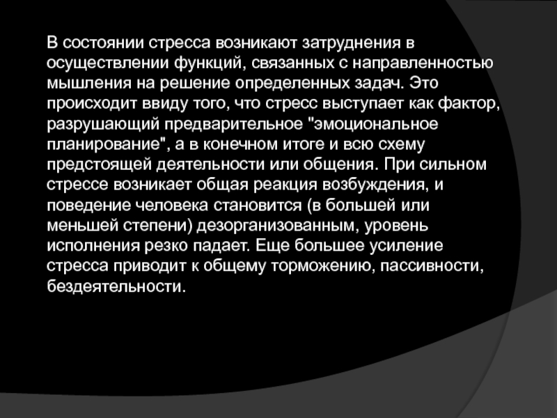Слайд 10В состоянии стресса возникают затруднения в осуществлении функций, связанных с