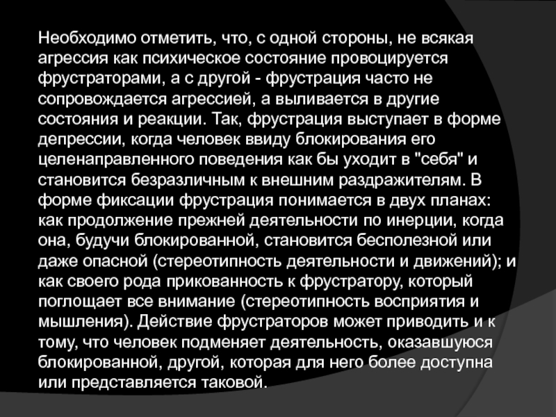 не сопровождается агрессией, а выливается в другие состояния и реакции. Так, фрустрация выступает в форме депрессии, когда человек ввиду блокирования его целенаправленного поведения как бы уходит в "себя" и становится безразличным к внешним раздражителям. В форме фиксации фрустрация понимается в двух планах: как продолжение прежней деятельности по инерции, когда она, будучи блокированной, становится бесполезной или даже опасной (стереотипность деятельности и движений); и как своего рода прикованность к фрустратору, который поглощает все внимание (стереотипность восприятия и мышления). Действие фрустраторов может приводить и к тому, что человек подменяет деятельность, оказавшуюся блокированной, другой, которая для него более доступна или представляется таковой.
