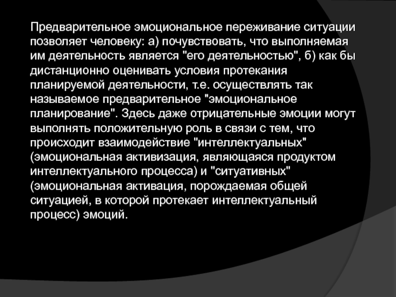 Слайд 6Предварительное эмоциональное переживание ситуации позволяет человеку: а) почувствовать, что выполняемая
