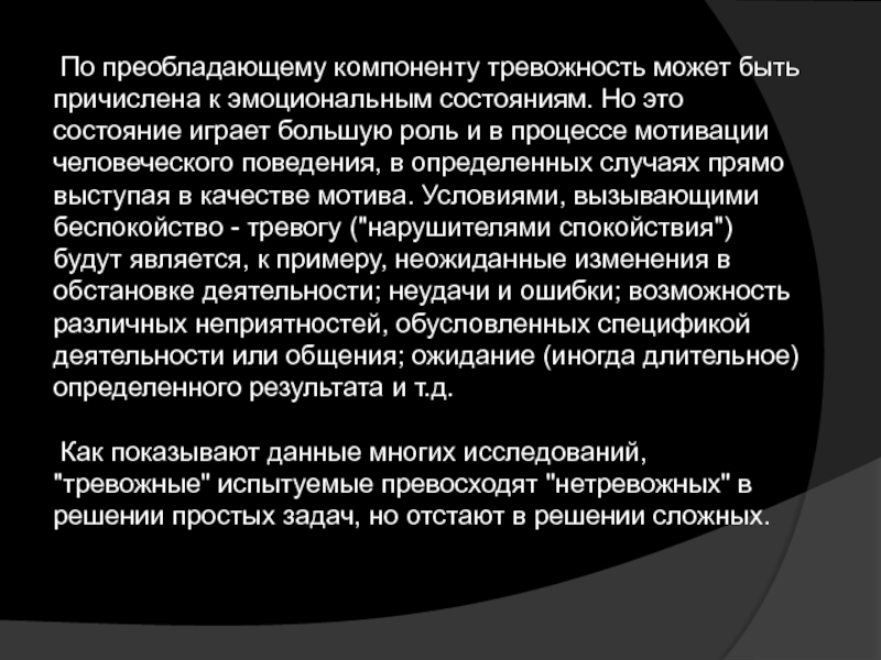 мотивации человеческого поведения, в определенных случаях прямо выступая в качестве мотива. Условиями, вызывающими беспокойство - тревогу ("нарушителями спокойствия") будут является, к примеру, неожиданные изменения в обстановке деятельности; неудачи и ошибки; возможность различных неприятностей, обусловленных спецификой деятельности или общения; ожидание (иногда длительное) определенного результата и т.д.