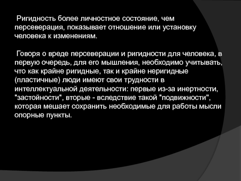 ригидности для человека, в первую очередь, для его мышления, необходимо учитывать, что как крайне ригидные, так и крайне неригидные (пластичные) люди имеют свои трудности в интеллектуальной деятельности: первые из-за инертности, "застойности", вторые - вследствие такой "подвижности", которая мешает сохранить необходимые для работы мысли опорные пункты.