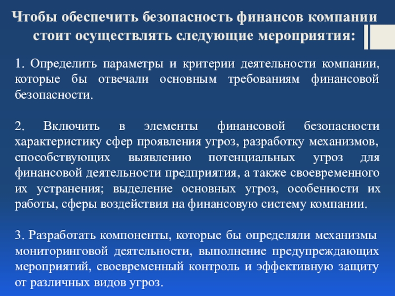 Чтобы обеспечить безопасность финансов компании стоит осуществлять следующие мероприятия: