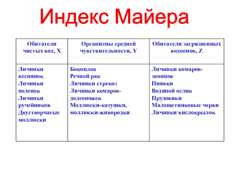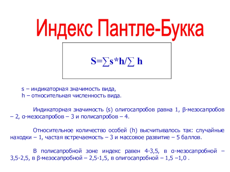 В полисапробной зоне индекс равен 4-3,5, в α-мезосапробной – 3,5-2,5, в β-мезосапробной – 2,5-1,5, в олигосапробной – 1,5 –1,0 .