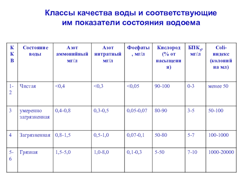 Слайд 7Классы качества воды и соответствующие им показатели состояния водоема