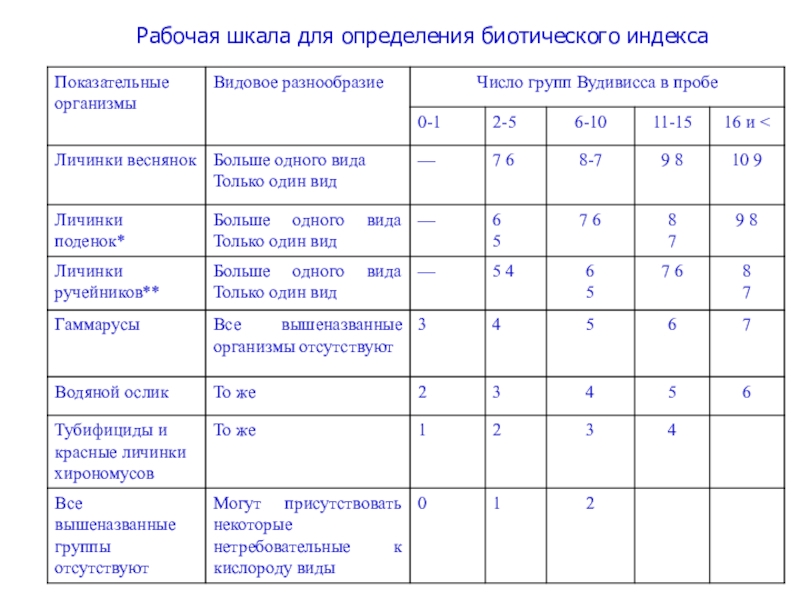 Слайд 10Рабочая шкала для определения биотического индекса