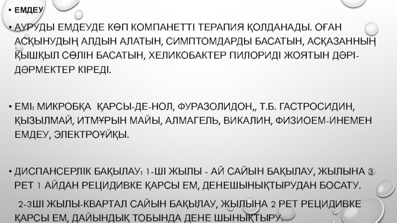 Емі: Микробқа қарсы-Де-нол, фуразолидон,, т.б. гастросидин, қызылмай, итмұрын майы, алмагель, викалин, Физиоем-инемен емдеу, электроұйқы.