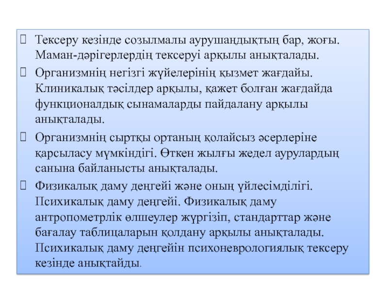 Слайд 5Тексеру кезінде созылмалы аурушаңдықтың бар, жоғы. Маман-дәрігерлердің тексеруі арқылы анықталады.