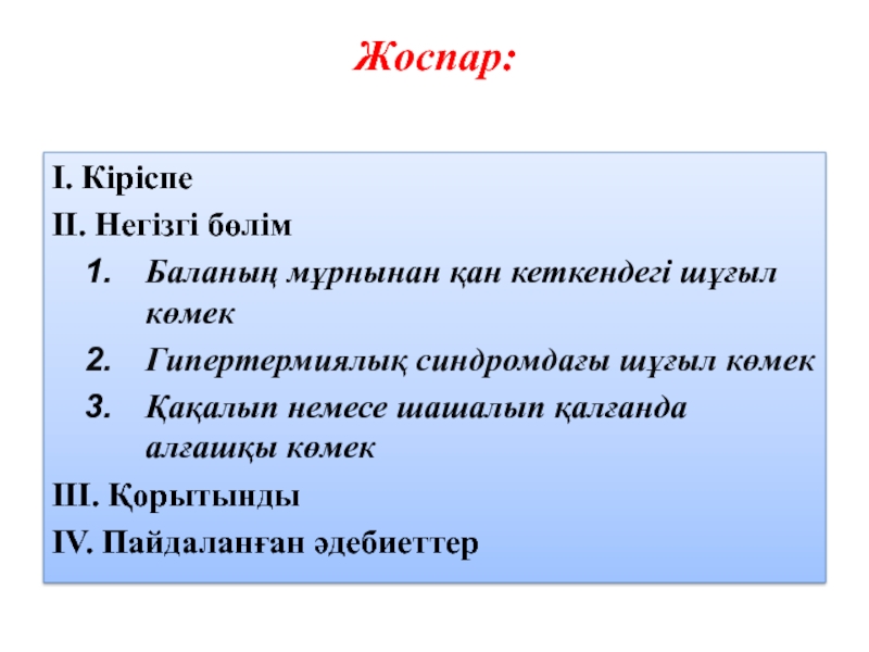 Слайд 9Баланың мұрнынан қан кеткендегі шұғыл көмек
