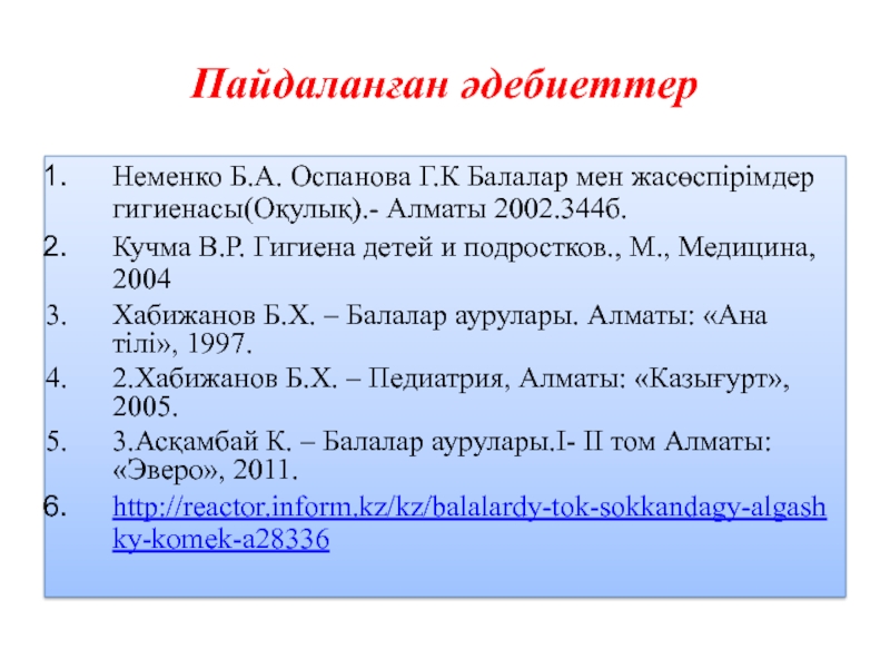 2.Хабижанов Б.Х. – Педиатрия, Алматы: «Казығурт», 2005.