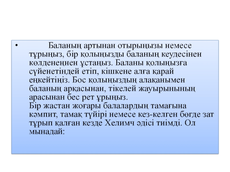 - баланы отырғызу, иықтарын алға сәл еңкейту;