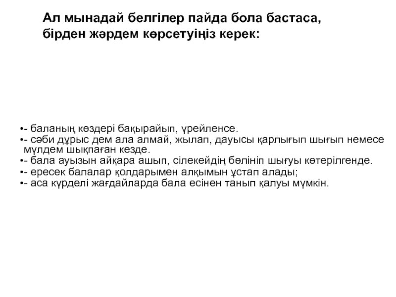 Слайд 16Ал мынадай белгілер пайда бола бастаса, бірден жәрдем көрсетуіңіз керек: