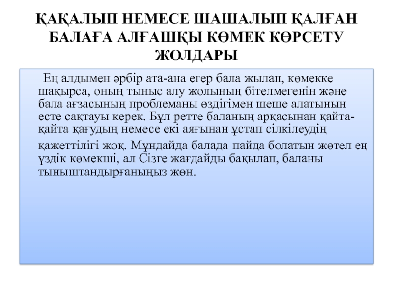 Слайд 14ҚАҚАЛЫП НЕМЕСЕ ШАШАЛЫП ҚАЛҒАН БАЛАҒА АЛҒАШҚЫ КӨМЕК КӨРСЕТУ ЖОЛДАРЫ