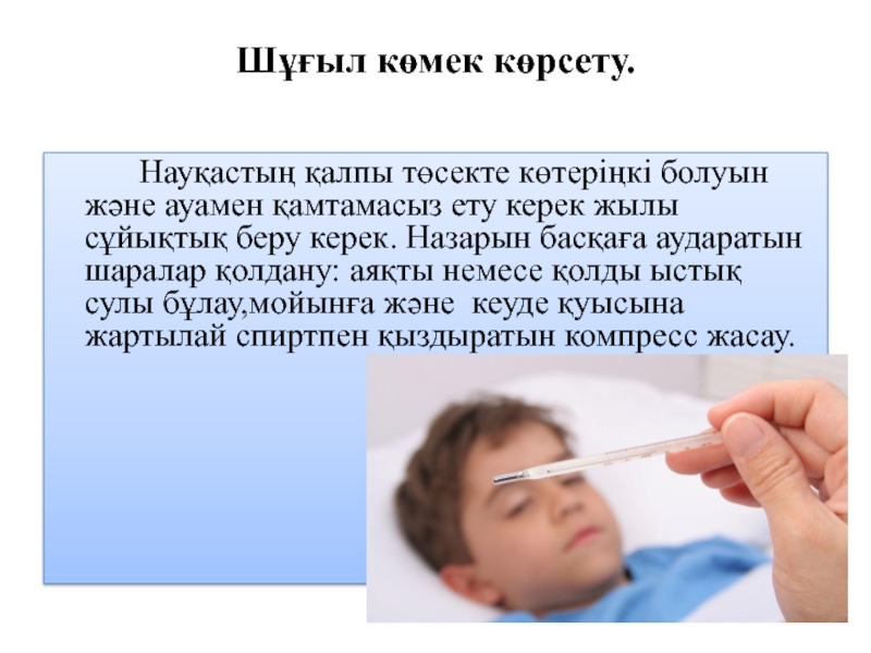 - 37,5-38оС – физикалық салқындатуды жүргізу: баланың денесін жалаңаштау, терісін спиртпен немесе асханалық сірке сумен сүрту, шап аймағына, бауыр тұсына салқын қою, желдеткішті қосу, асқазанын және ішегін бөлме температурасындағы сумен жуу;