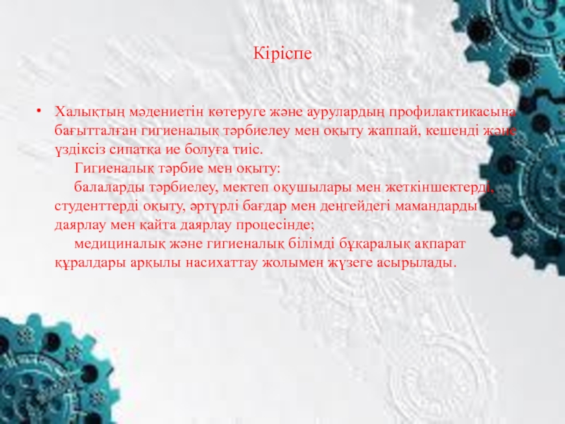 Халықтың мәдениетiн көтеруге және аурулардың профилактикасына бағытталған гигиеналық тәрбиелеу мен