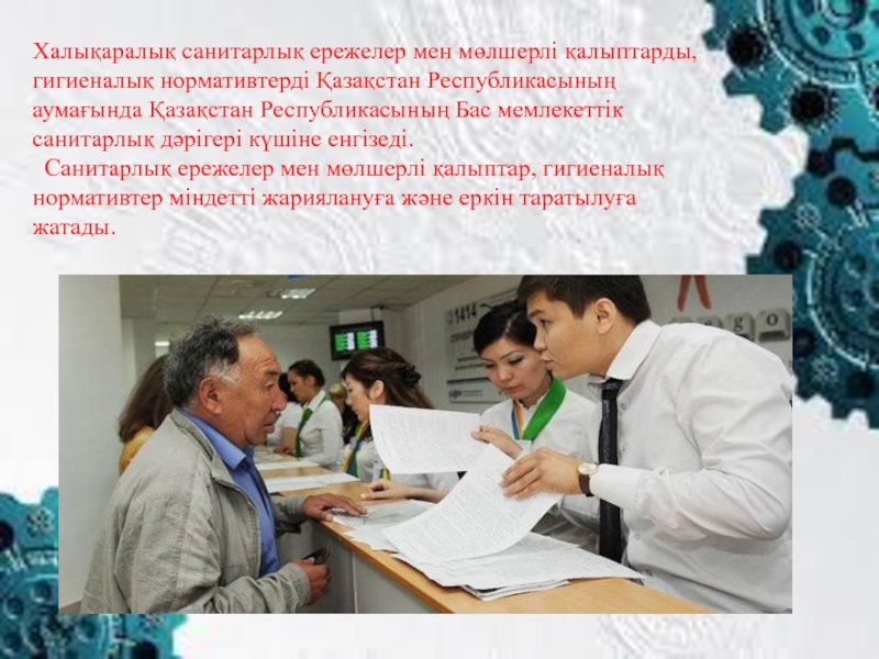 Слайд 16Халықаралық санитарлық ережелер мен мөлшерлi қалыптарды, гигиеналық нормативтердi Қазақстан Республикасының