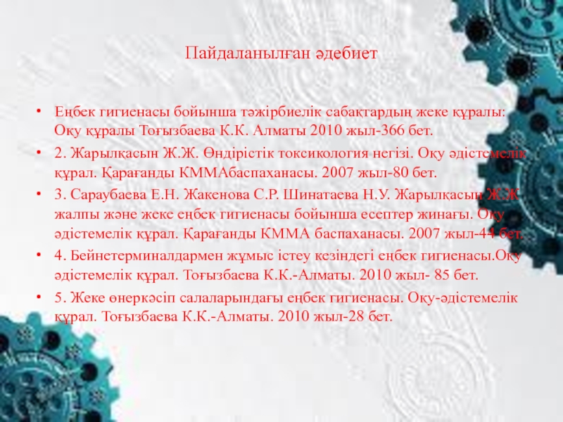 5. Жеке өнеркәсіп салаларындағы еңбек гигиенасы. Оқу-әдістемелік құрал. Тоғызбаева К.К.-Алматы. 2010 жыл-28 бет.
