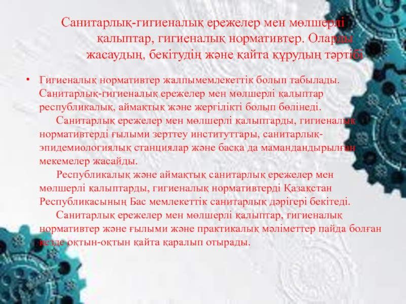 Гигиеналық нормативтер жалпымемлекеттiк болып табылады. Санитарлық-гигиеналық ережелер